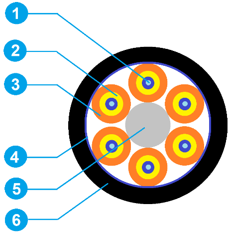 Оптическое волокно – до 6-ти одномодовых или многомодовых ОВ в плотном или полуплотном буфере 900 или 1200 мкм в оболочке из не распространяющего горение безгалогенного компаунда LSZH.