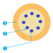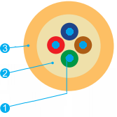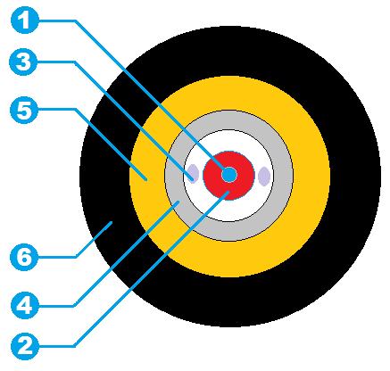 Оптическое волокно – до 6-ти одномодовых или многомодовых ОВ в плотном или полуплотном буфере 900 или 1200 мкм в оболочке из не распространяющего горение безгалогенного компаунда LSZH.